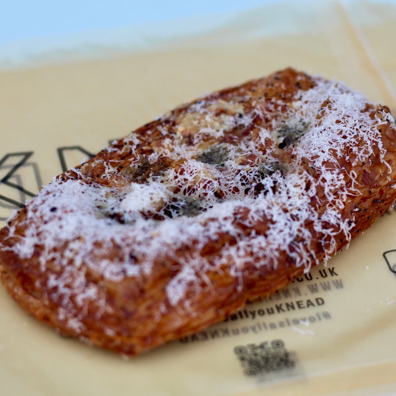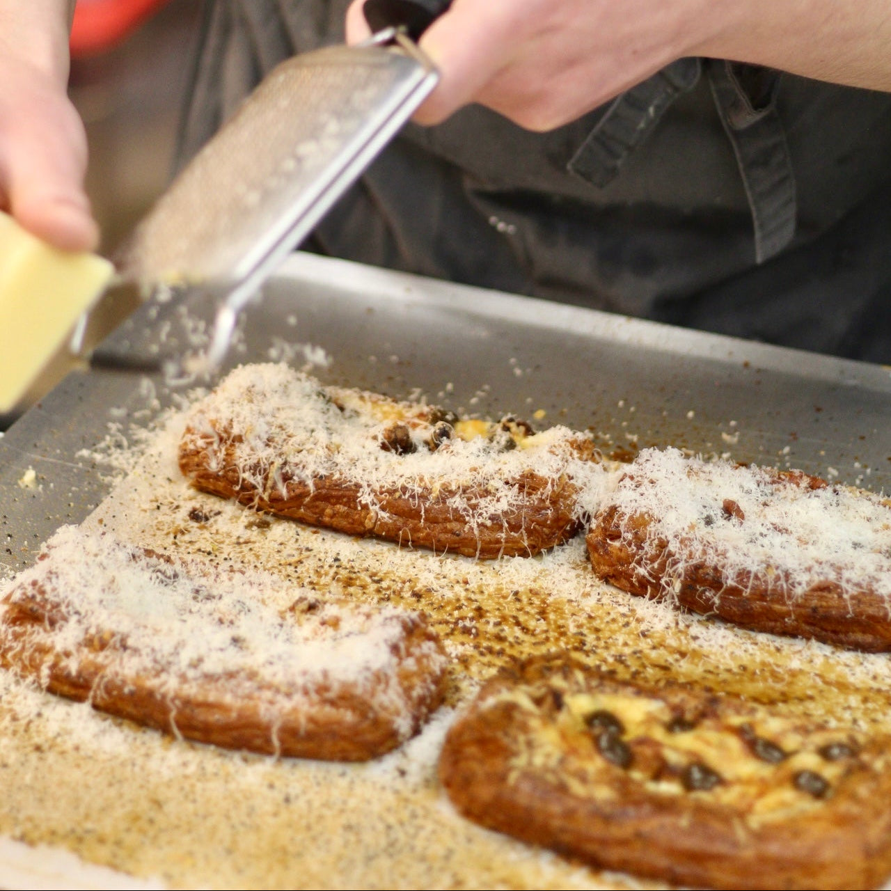 Flaky, buttery Danish pastry filled with roasted cauliflower and a savoury raisin & caper purée, finished with grated Parmesan. Baked until golden and crisp, this indulgent savoury Danish balances rich cheese, gentle sweetness and sharp, briny notes. A bold, satisfying pastry – perfect for brunch or lunch.
