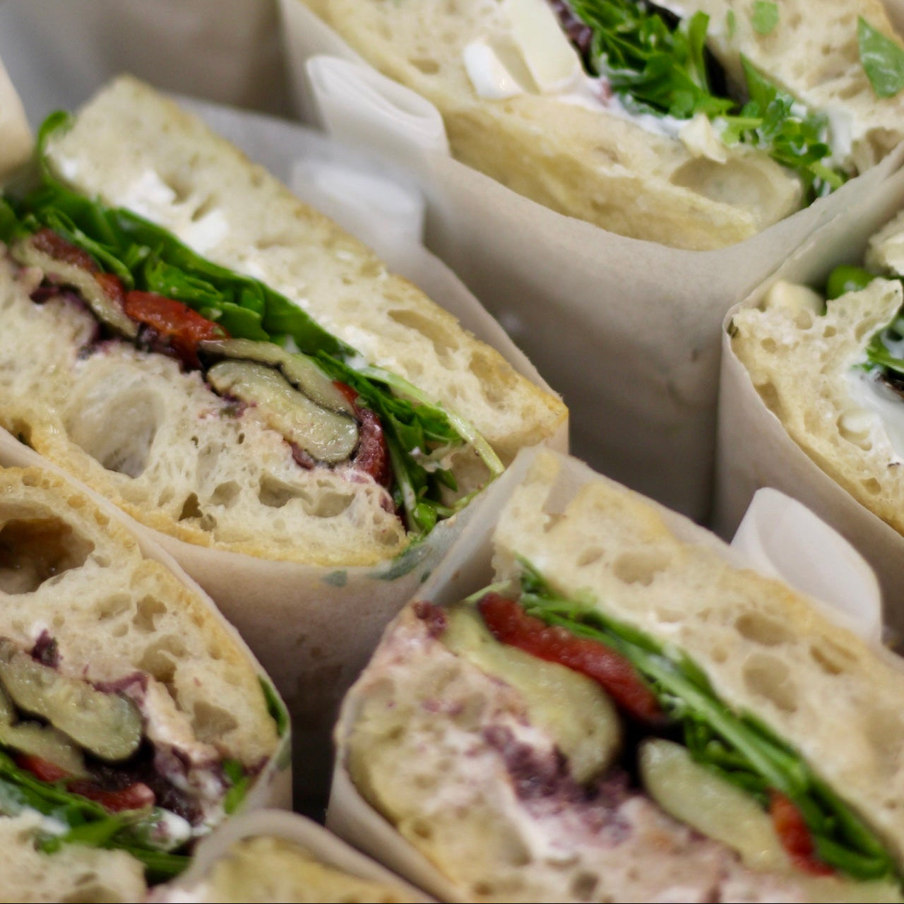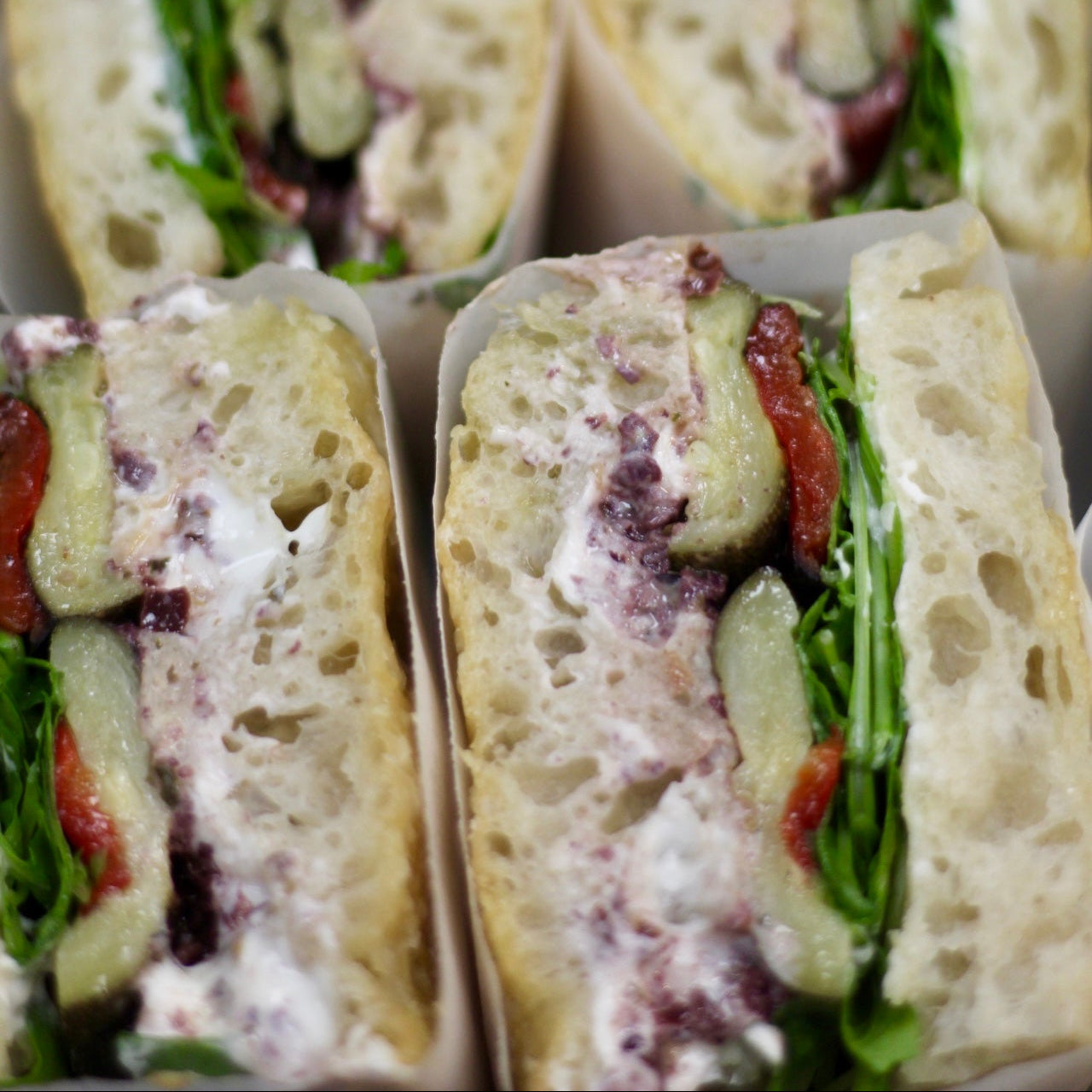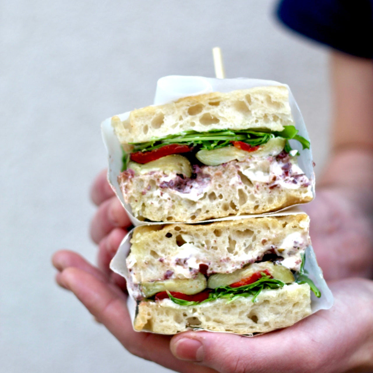 A vibrant vegetarian focaccia sandwich filled with grilled courgette, roasted pepper and olives, finished with creamy garlic aioli. Packed with Mediterranean flavours, this sandwich is soft, savoury and perfectly balanced with a touch of char from the veg. Ideal for a light lunch or a flavourful snack on the go.