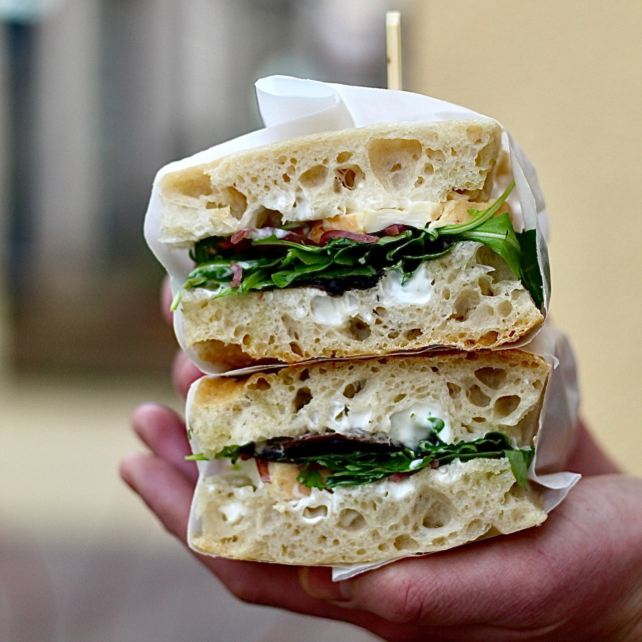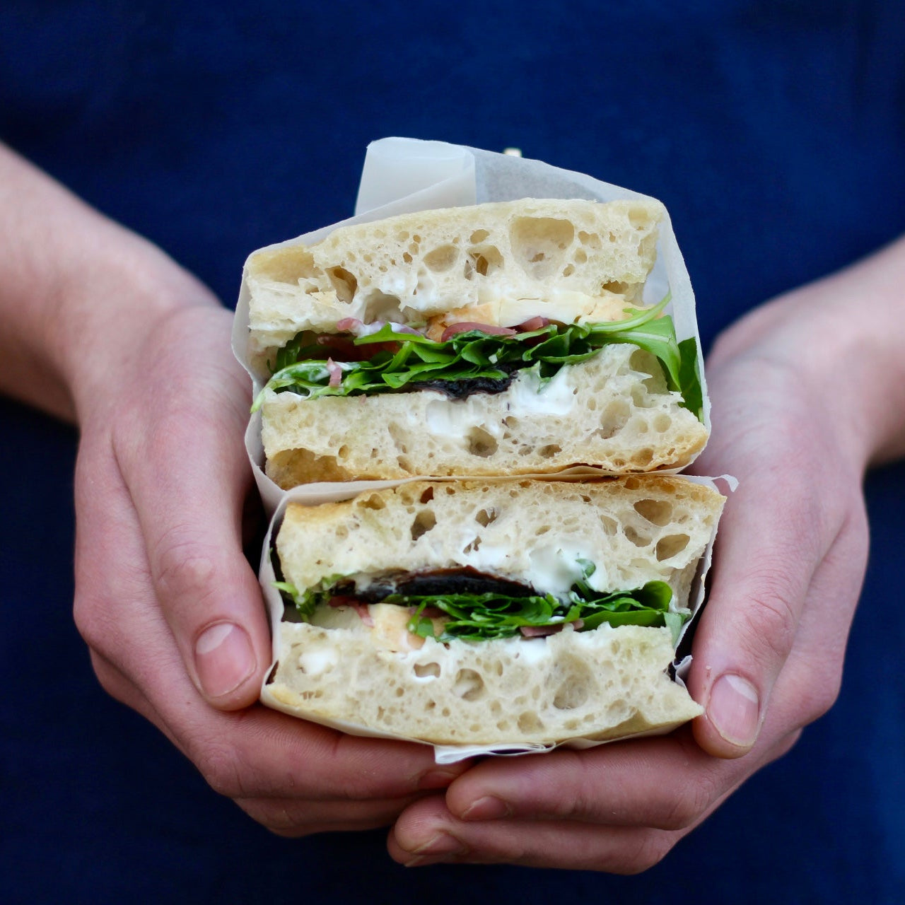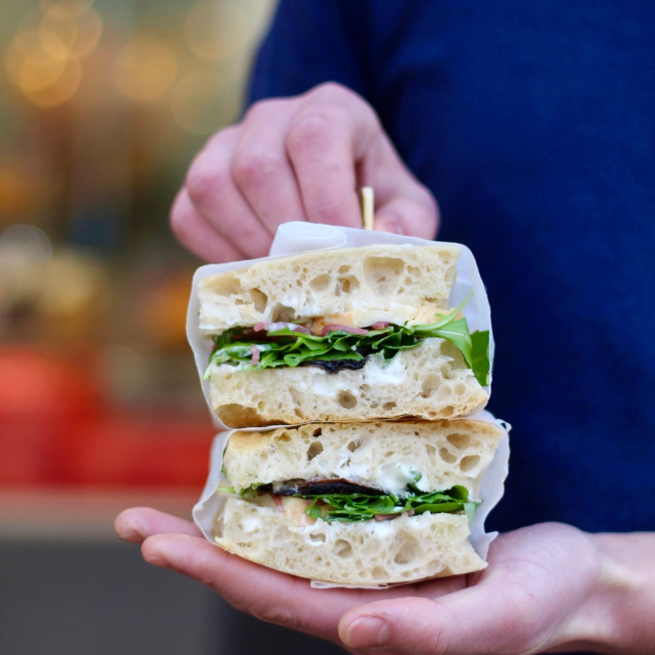 A rich and savoury focaccia sandwich filled with creamy Taleggio cheese, roasted field mushrooms, pickled shallots and peppery rocket. Baked in our signature focaccia, this sandwich delivers earthy, tangy flavours with a soft, chewy texture. Perfect for a satisfying lunch or a flavour-packed snack.