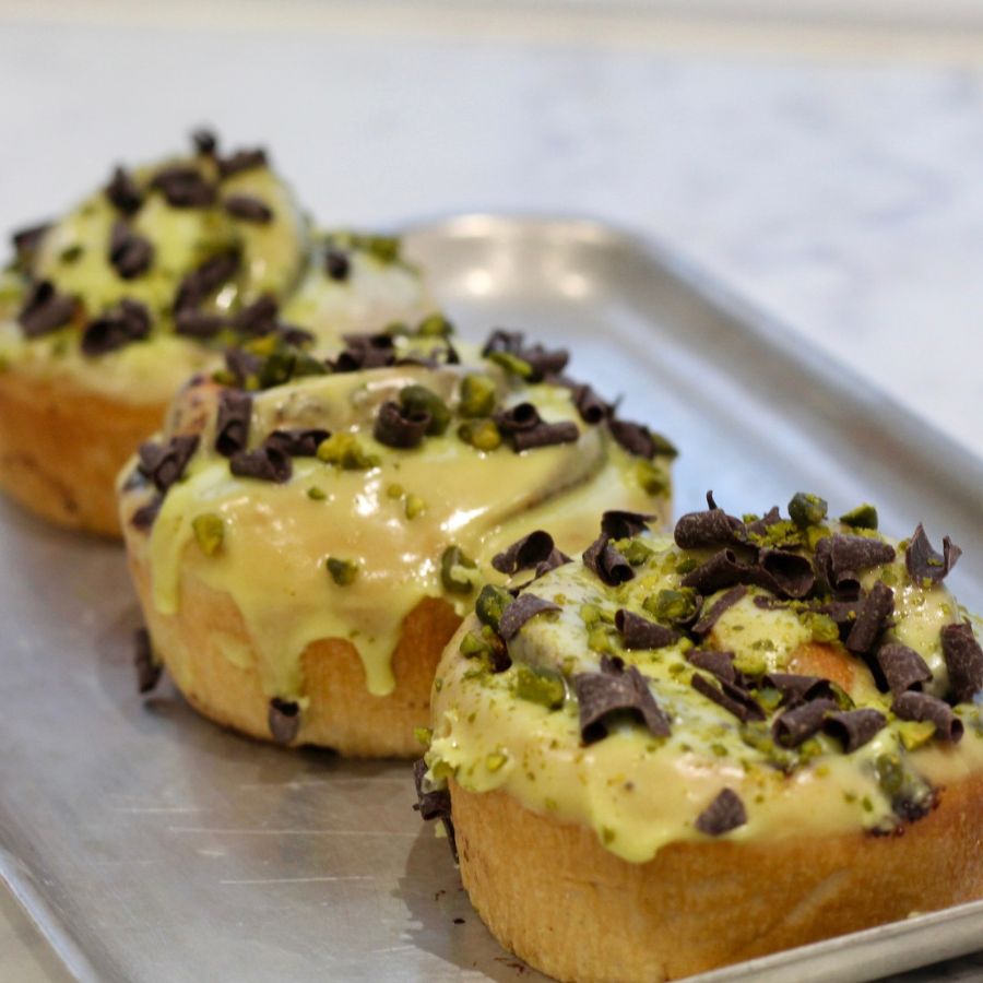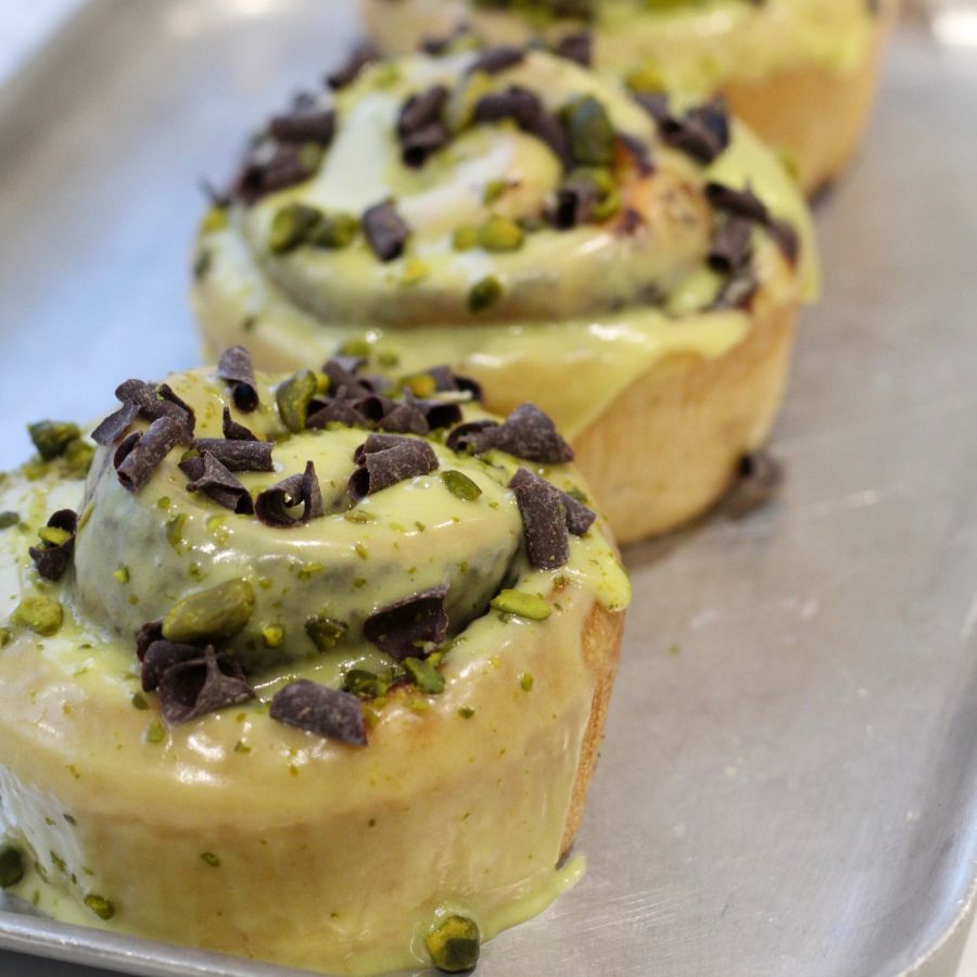 Dark Chocolate and pistachio pastry.  Indulge in our luxurious Dubai-style bun, crafted from soft, buttery pastry layered with rich dark chocolate and topped with crushed pistachios. Each bun is baked to golden perfection, combining deep chocolate flavour with the delicate crunch of roasted nuts.