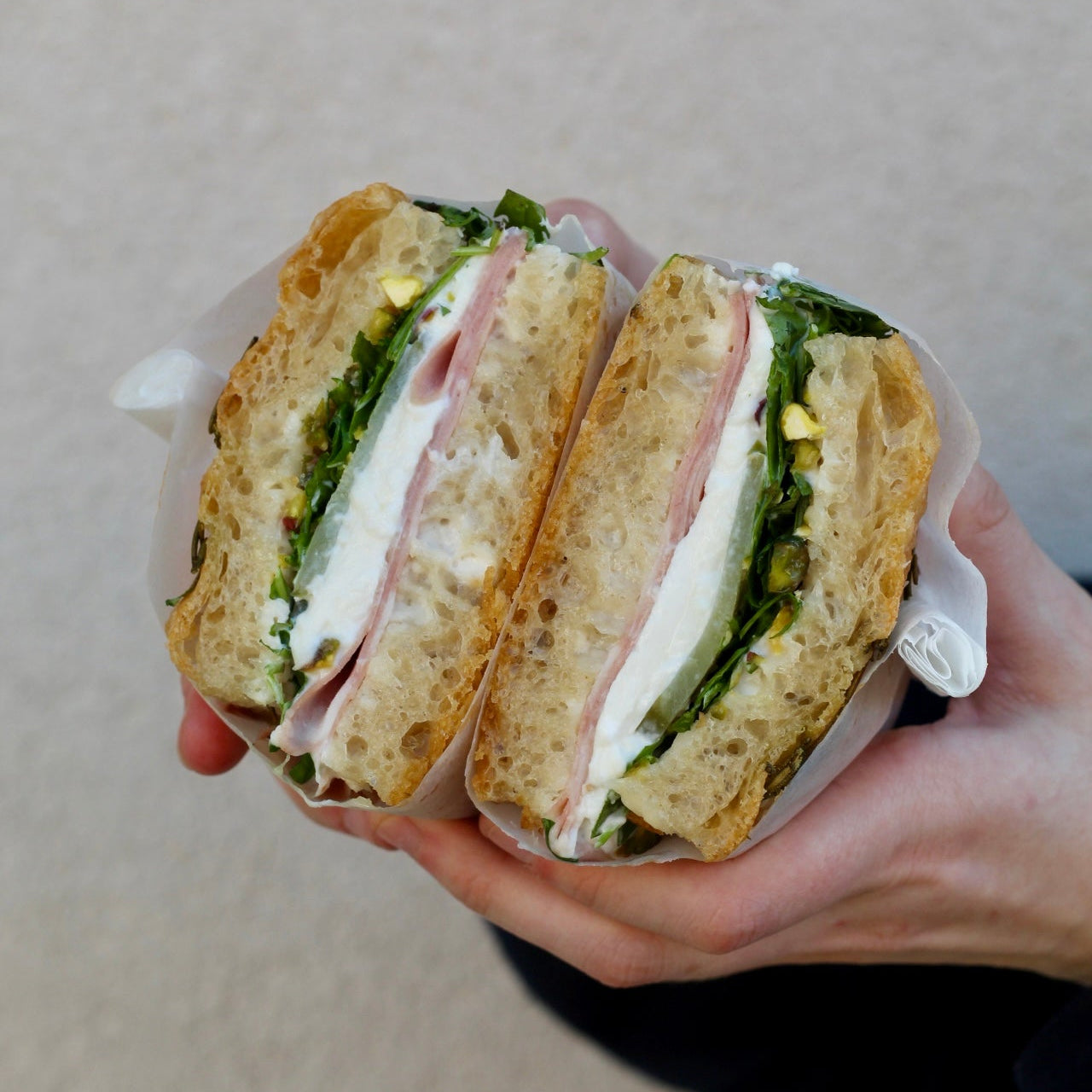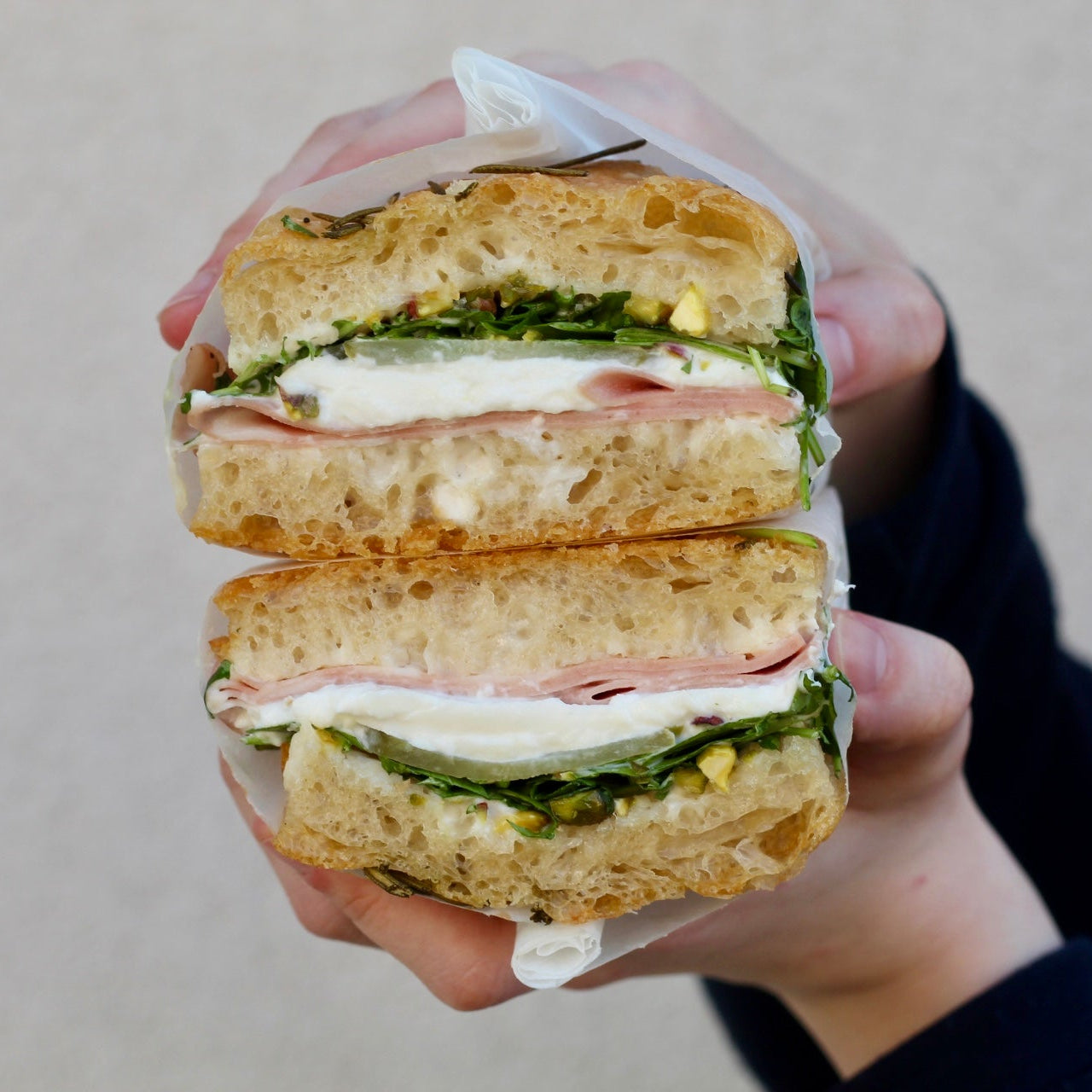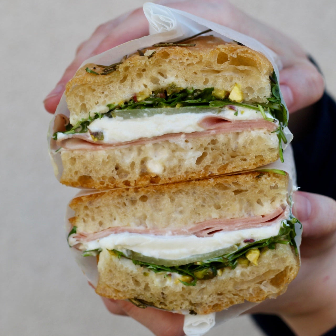 A soft, airy focaccia sandwich layered with sliced mortadella and creamy burrata, finished with parmesan aioli, pickled cucumbers, chopped pistachios and wild rocket. This indulgent sandwich balances rich, savoury flavours with a fresh crunch, perfect for a satisfying lunch or gourmet grab-and-go bite.